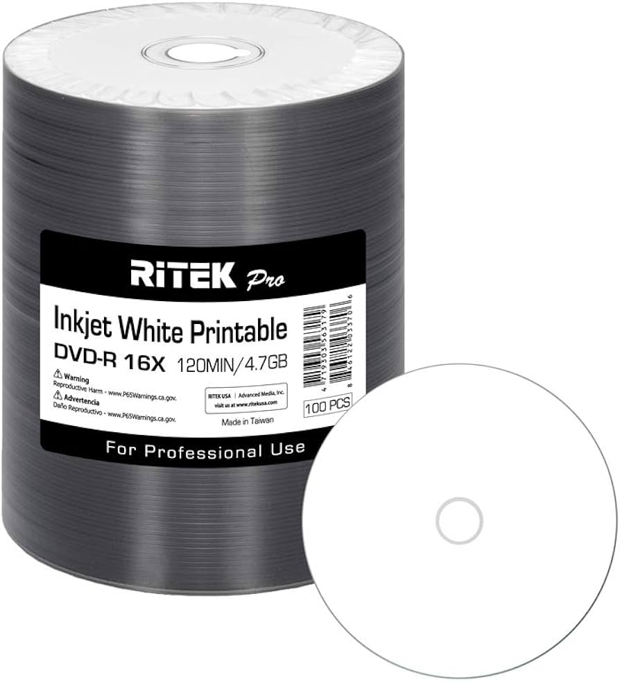 Amazon 100 Pack Ritek Pro Professional Grade DVD R 16X 4 7GB AZO Dye MID MXL RG04 White Inkjet Hub Printable Blank Media Recordable Disc Electronics