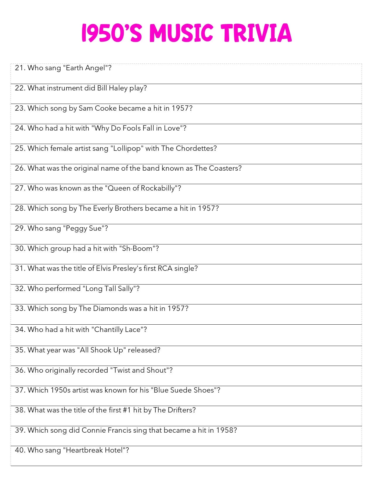 1950s Music Trivia 100 Printable Questions For A Rockin Retro Quiz Night Etsy