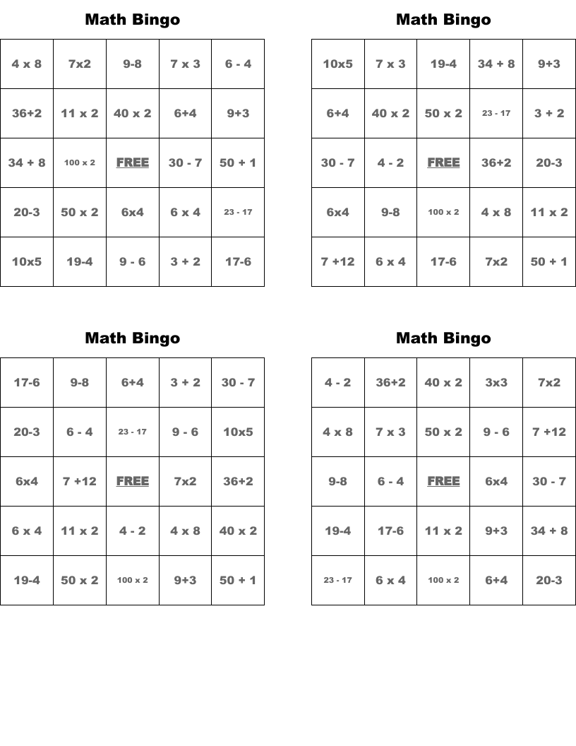 Math Bingo Free Printable PDF Math Bingo Cards