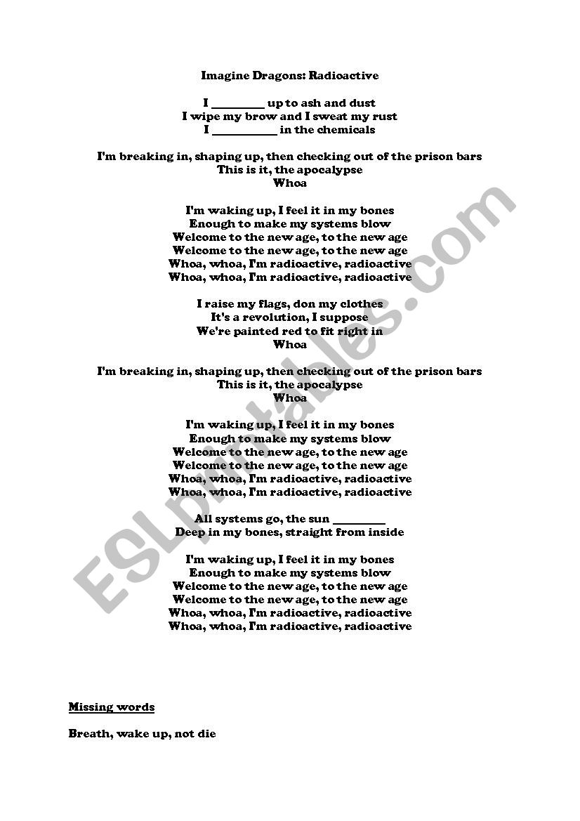 Imagine Dragon Radioactive song Lyrics ESL Worksheet By Niko 13