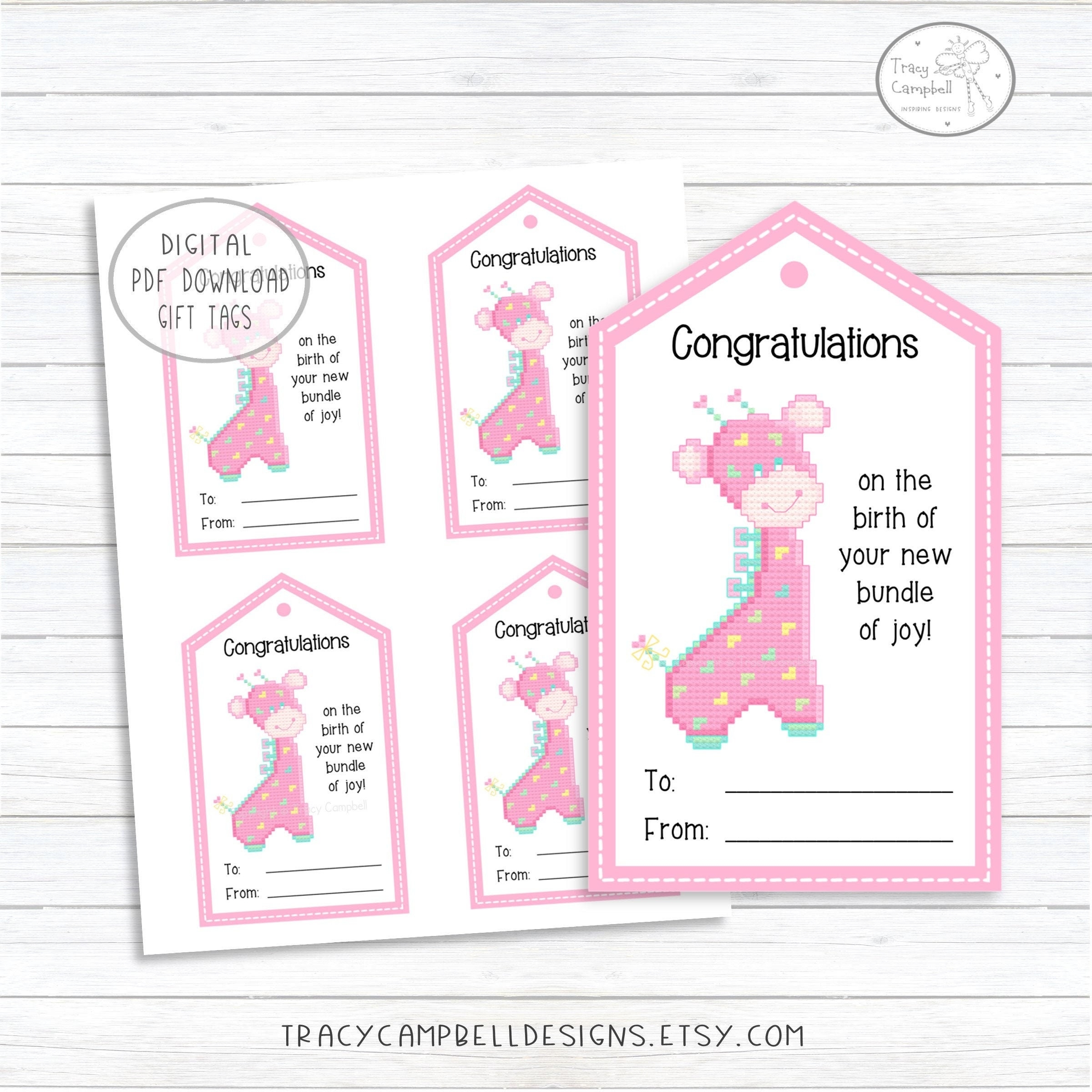 Congratulations New Baby Gift Tags Bundle Of Joy Printable Gift Tags Pink Giraffe Cross stitch inspired Design Instant Digital PDF Etsy