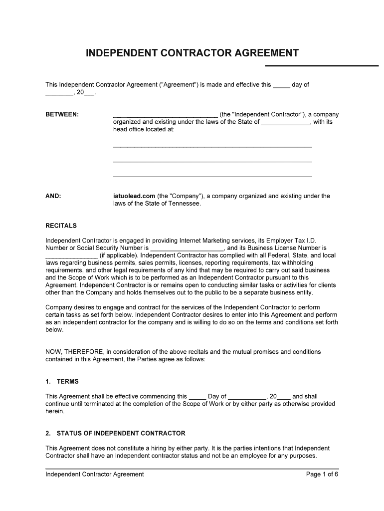 Free 1 Page Simple Independent Contractor Agreement Template PDF Word
