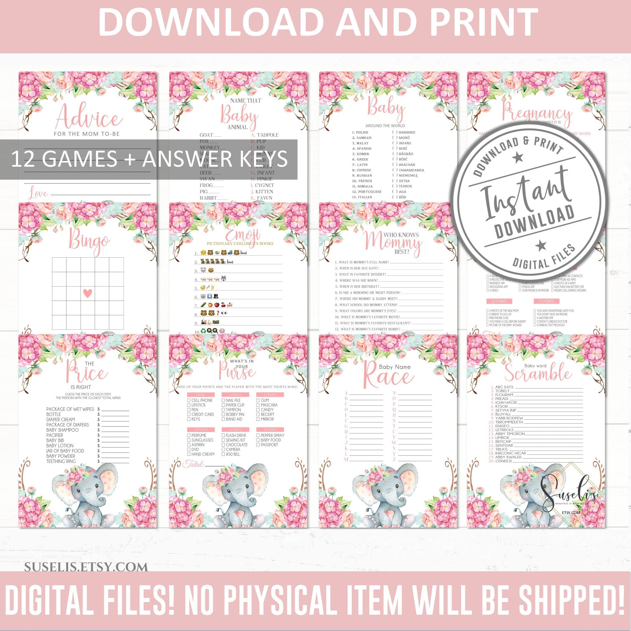 Printable Baby Shower Game Bundle 12 Games Girl Elephant Theme Watercolor Flowers Safari Game Package Instant Download DIGITAL BS014 Etsy