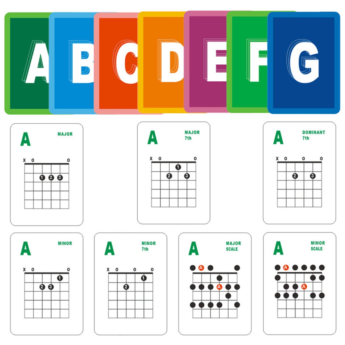 Each flash card features a different guitar chord, along with a diagram showing you exactly where to place your fingers on the fretboard. This visual aid makes it easy to learn the correct finger positions and memorize the chords quickly.