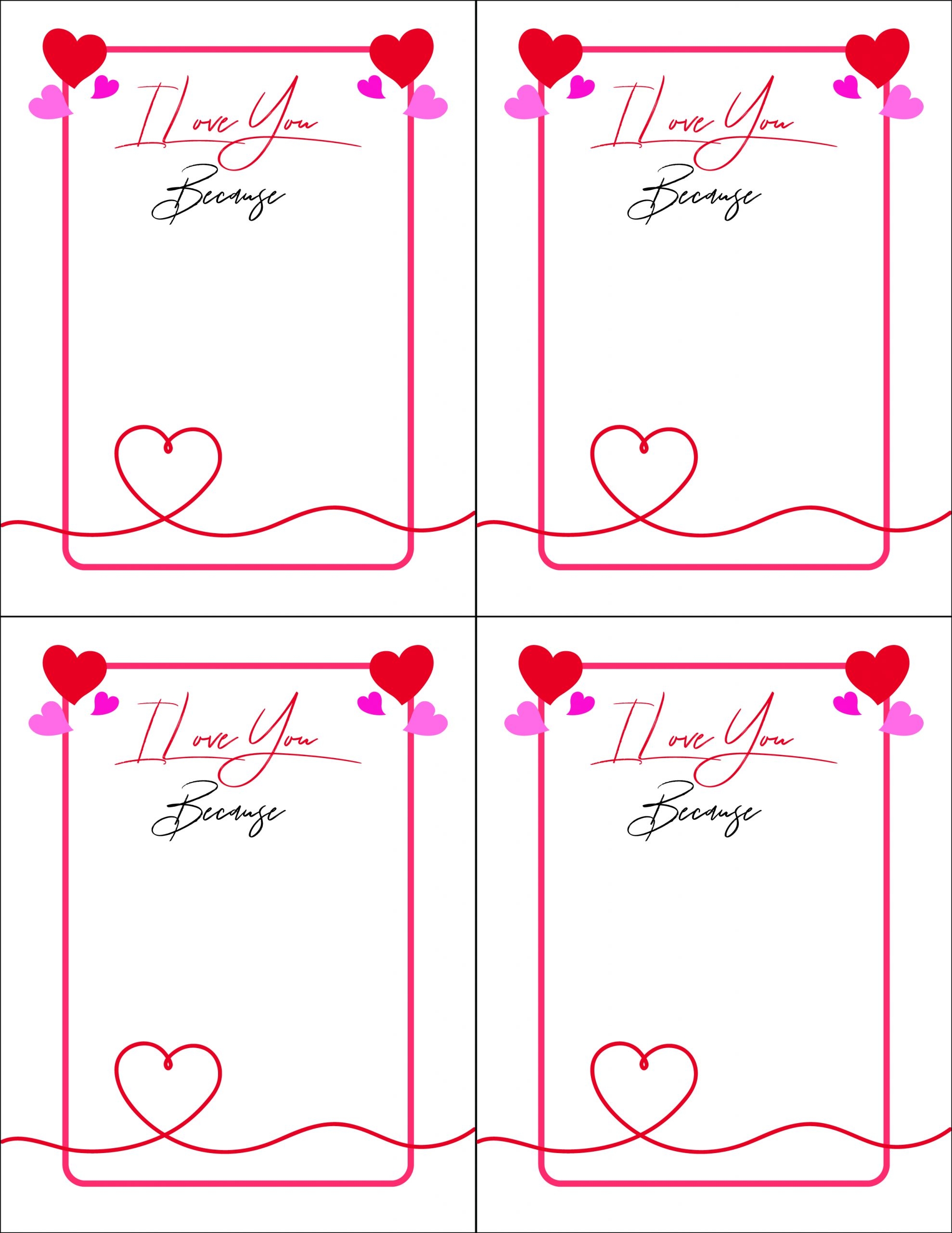 The “I Love You Because” printable template is simple yet powerful. Just fill in the blanks with your reasons for loving that special someone, print it out, and voila! You have a personalized message that they can cherish forever.