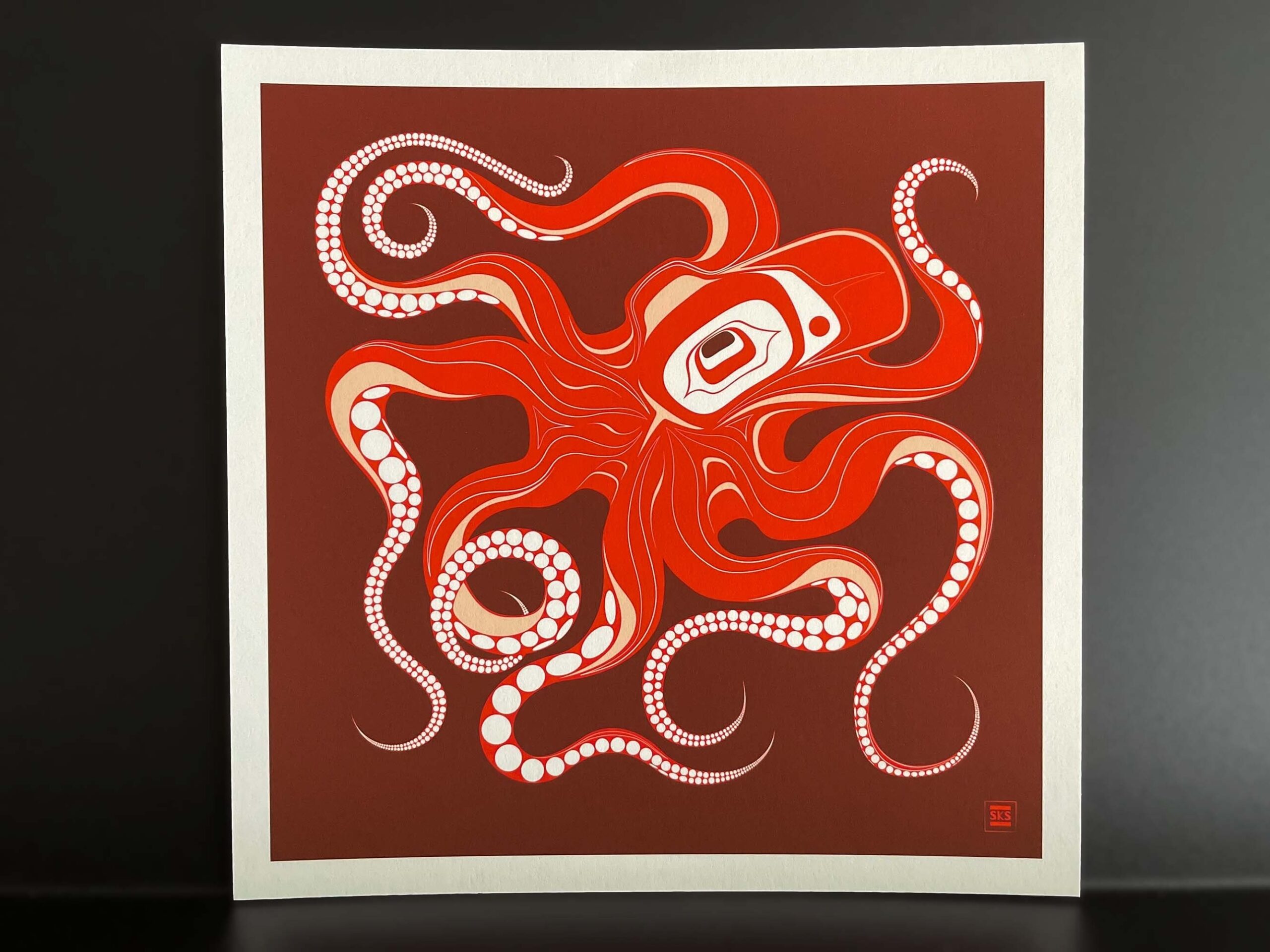 Native Northwest Coast Tlingit Octopus Giclee Print Orange red Left facing Etsy