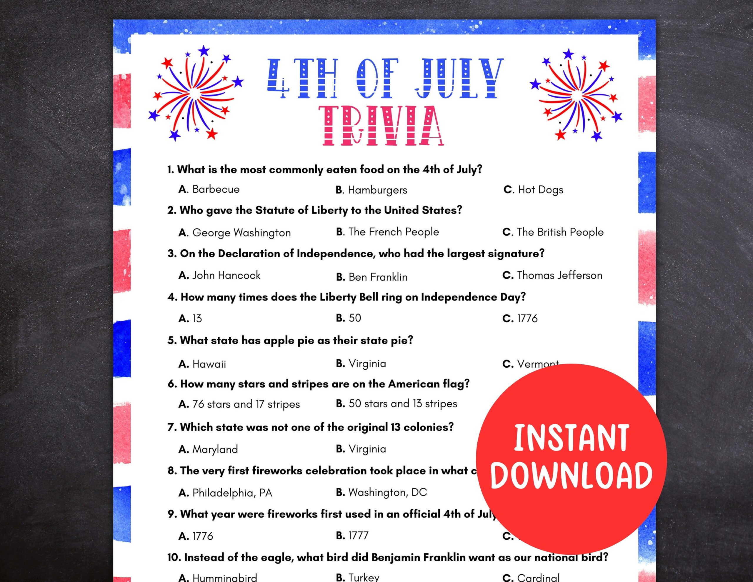 So why wait? Download and print out our printable 4th of July quiz today and add a touch of fun and excitement to your Independence Day celebrations. Test your knowledge, learn something new, and create lasting memories with your friends and family this 4th of July!