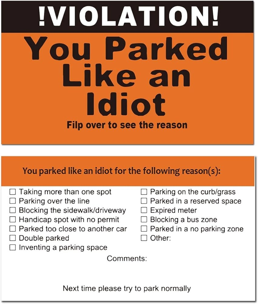 Amazon ReMarkable You Parked Like An Idiot Business Cards Bad Parking Cards Tick The Boxes On The Back To List Their Sins Get Justice Hilarious Prank Gag Gift