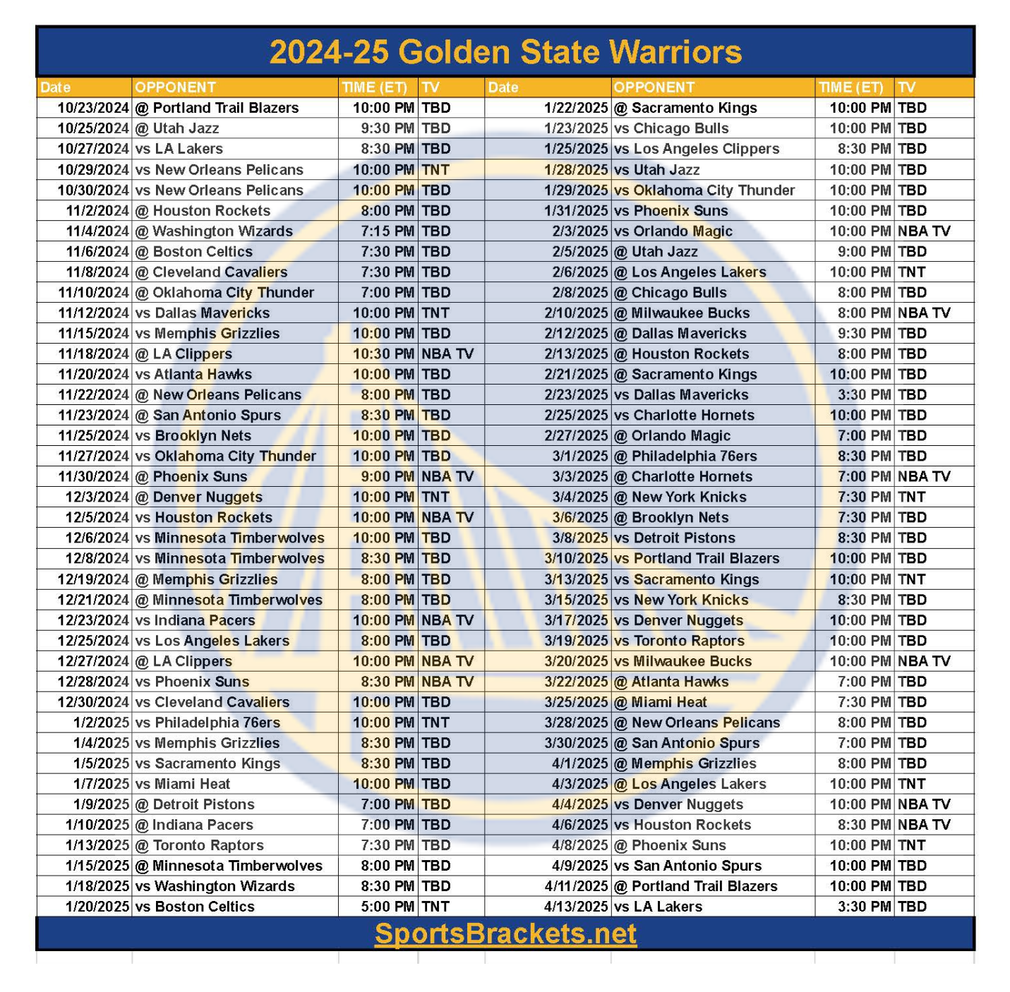 Printable 2024 25 Golden State Warriors Schedule TV Broadcasts And Matchups Sports Brackets