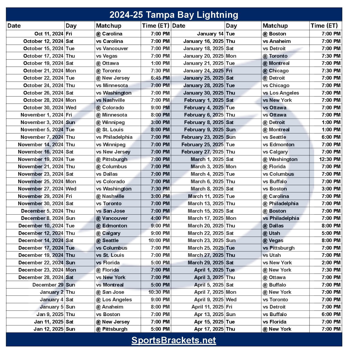 Printable 2024 25 Tampa Bay Lightning Schedule Matchups And TV Broadcasts Hockey Schedules