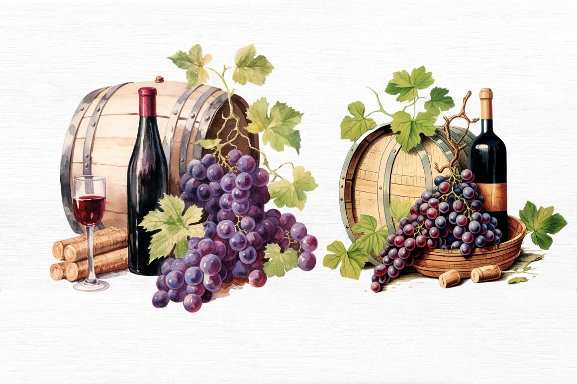 Vintage Grape Wine Bottle And Barrel Watercolor Clipart